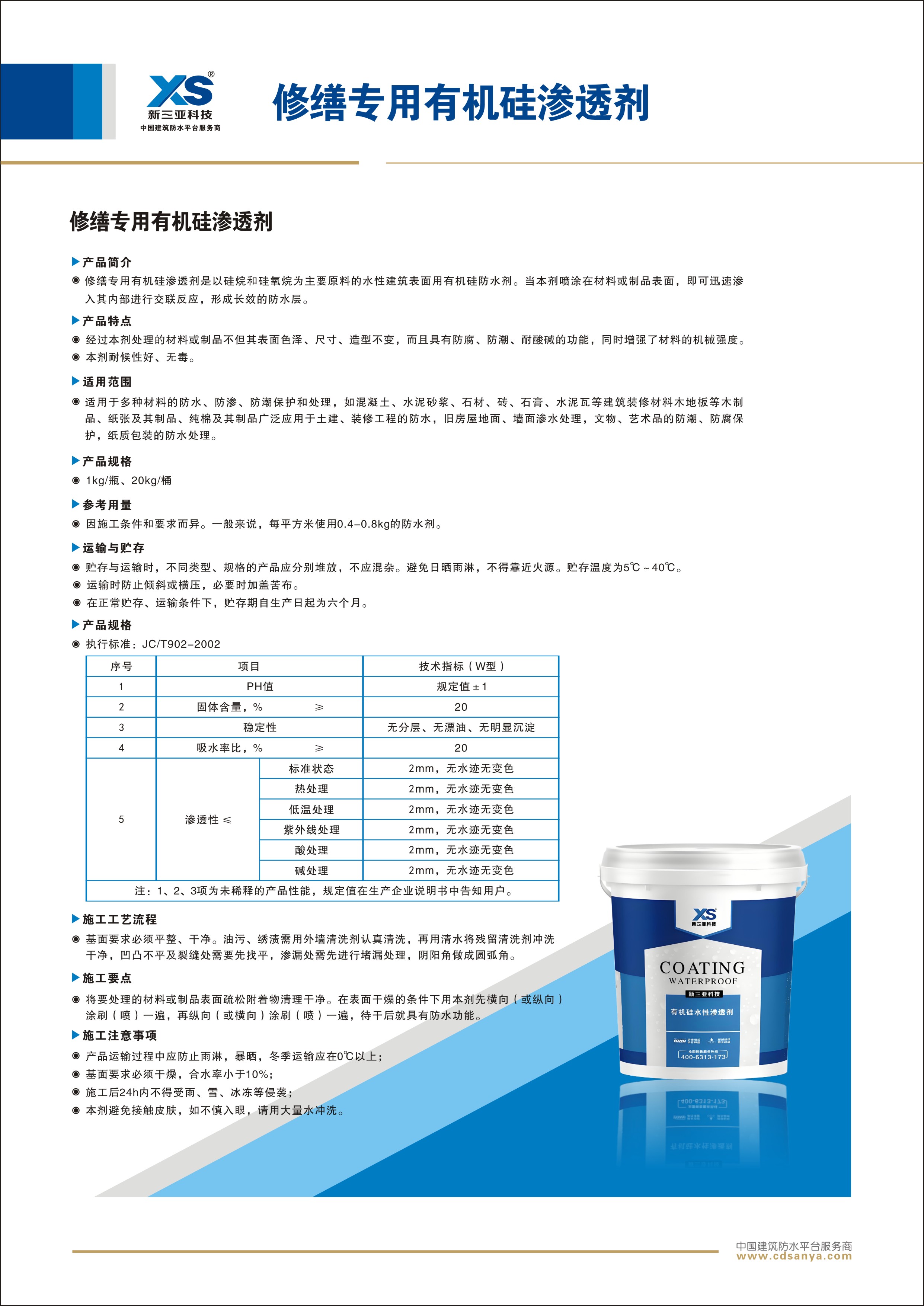 產(chǎn)品簡(jiǎn)介: 修繕專(zhuān)用有機(jī)硅滲透劑是以硅烷和硅氧烷為主要原料的水性建筑表面用有機(jī)硅防水劑。當(dāng)本劑噴涂在材料或制品表面,即可迅速滲入其內(nèi)部進(jìn)行交聯(lián)反應(yīng),形成長(zhǎng)效的防水層。 規(guī)格:5kg/桶